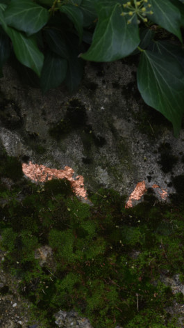 Sur les murs de la commune, des pierres rectangulaires, dorées à la feuille d’or, dessinent un alphabet énigmatique. Elles jalonnent l’espace, le métamorphosant en un terrain d’émerveillement et de contemplation.